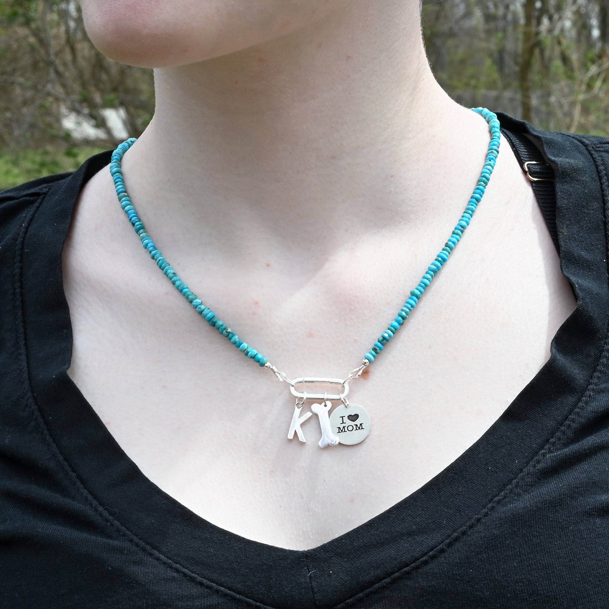 This Sleeping Beauty Turquoise necklace showcases the natural beauty of hand-cut, organic turquoise beads—each one uniquely shaped for a one-of-a-kind look. Finished with a sterling silver heart-shaped charm enhancer/lock, it’s perfect for adding your favorite charm or pendant. Sterling silver rings at each end of the necklace make it easy to switch out the lock or carabiner, giving you endless styling options.