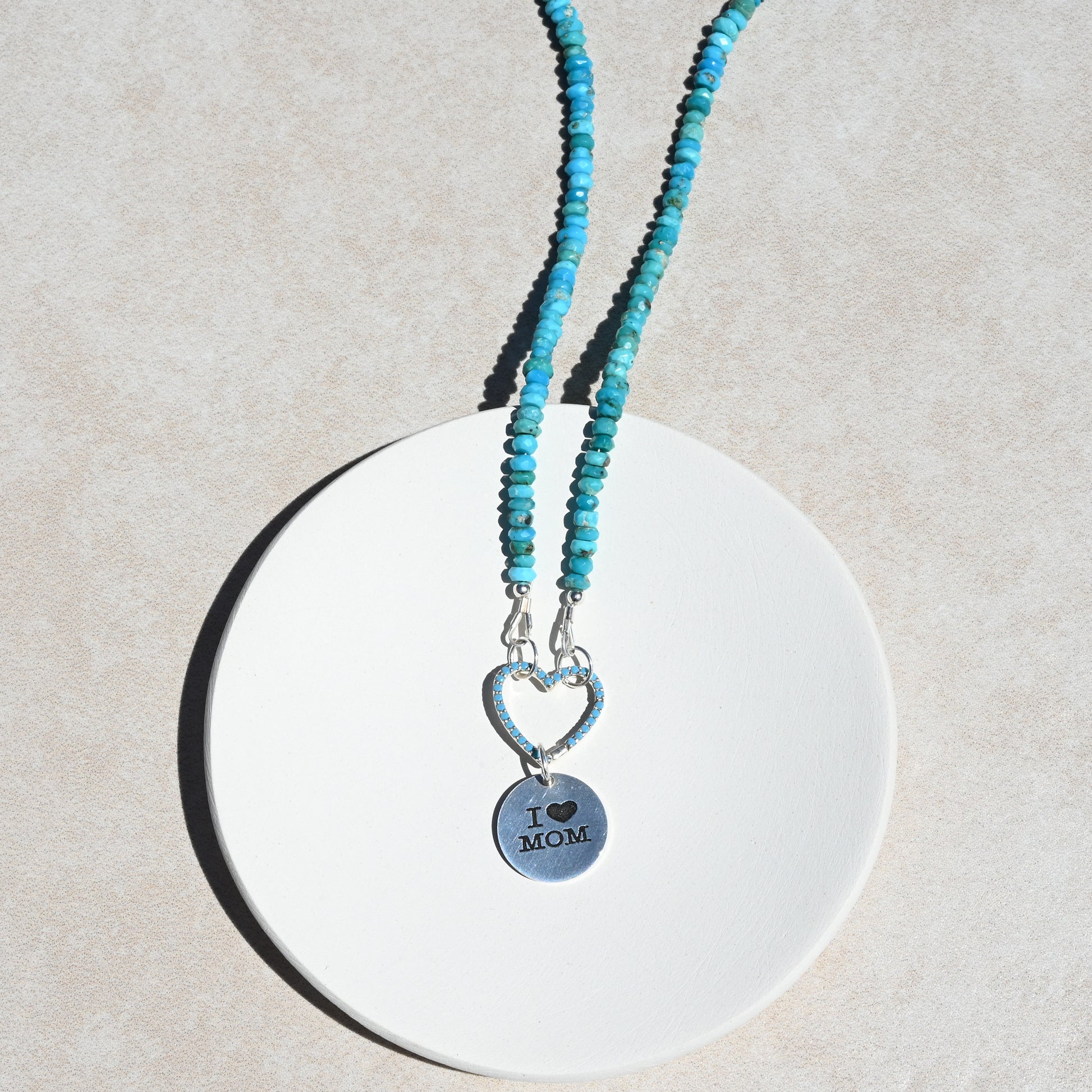 The Sleeping Beauty Turquoise used in this necklace is truly captivating. Each bead is cut by hand, resulting in a unique and organic design. The necklace is finished with a sterling silver heart charm enhancer/lock, allowing you to add a small charm or pendant for a personalized touch. The versatility of this necklace is further enhanced by the sterling silver rings on each end, which allows for easy interchangeability of the charm enhancer/lock or carabiner.
