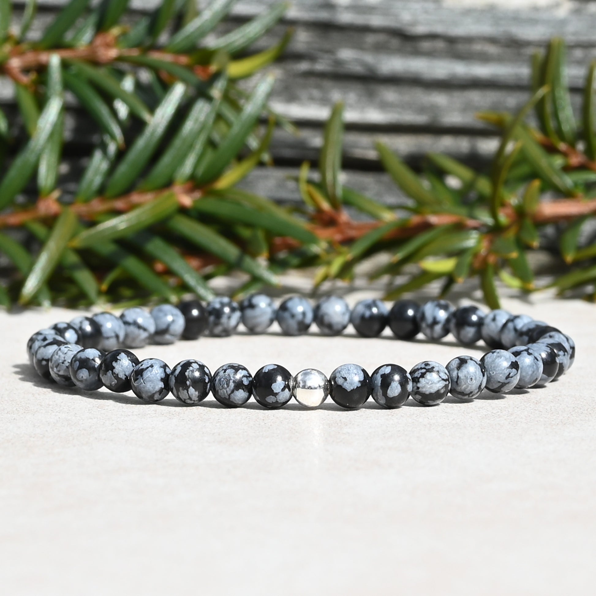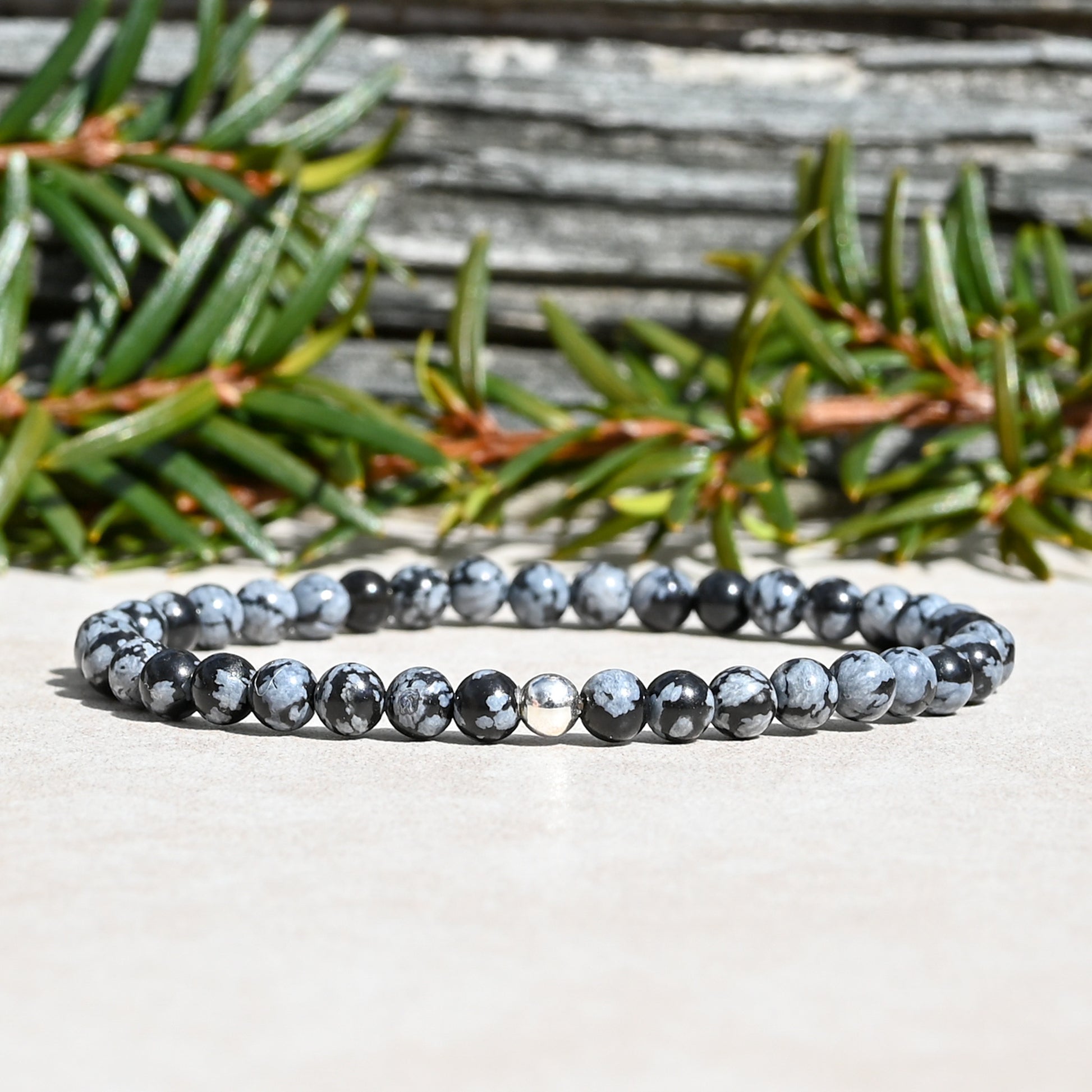 Enhance your outfit with this exquisite Snowflake Obsidian stretch bracelet. Its effortless design allows for easy wear and stunning stackability. Make a subtle statement or create a bold stacked look with this versatile bracelet that adds a touch of sophistication and glamour to any style. With Snowflake Obsidian beads, you can elevate your ensemble to new heights.