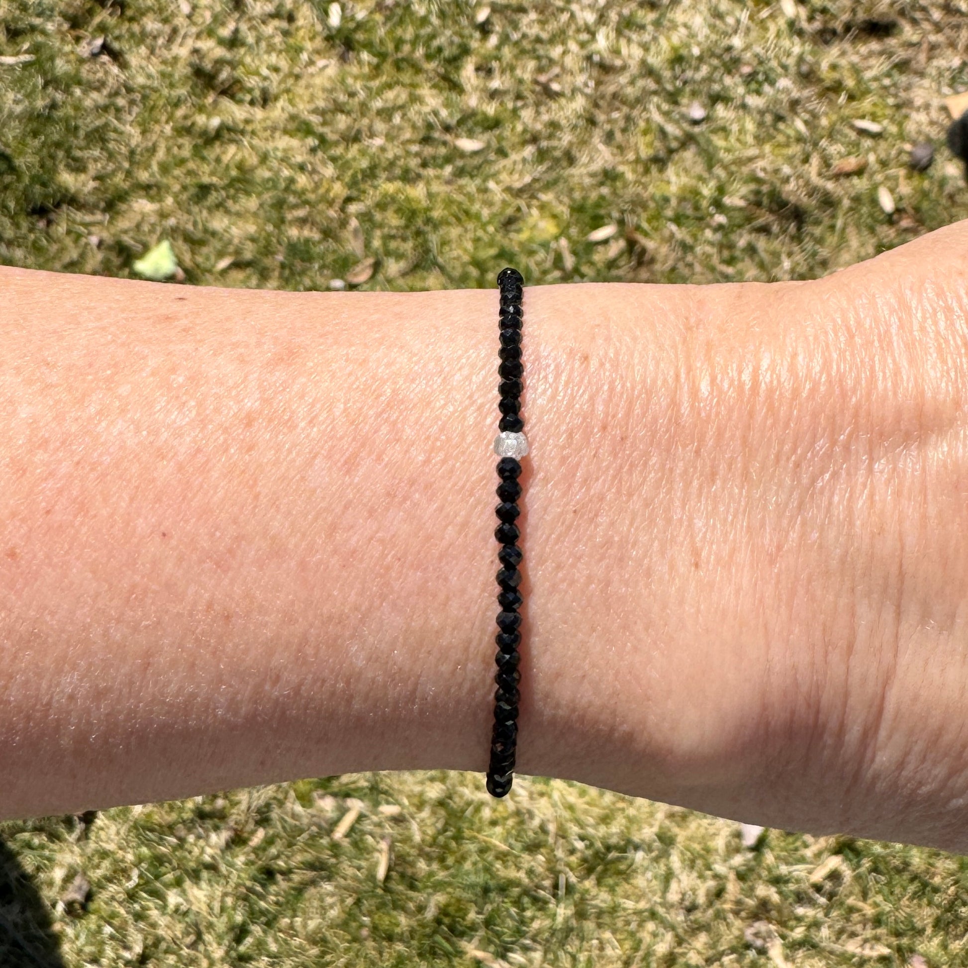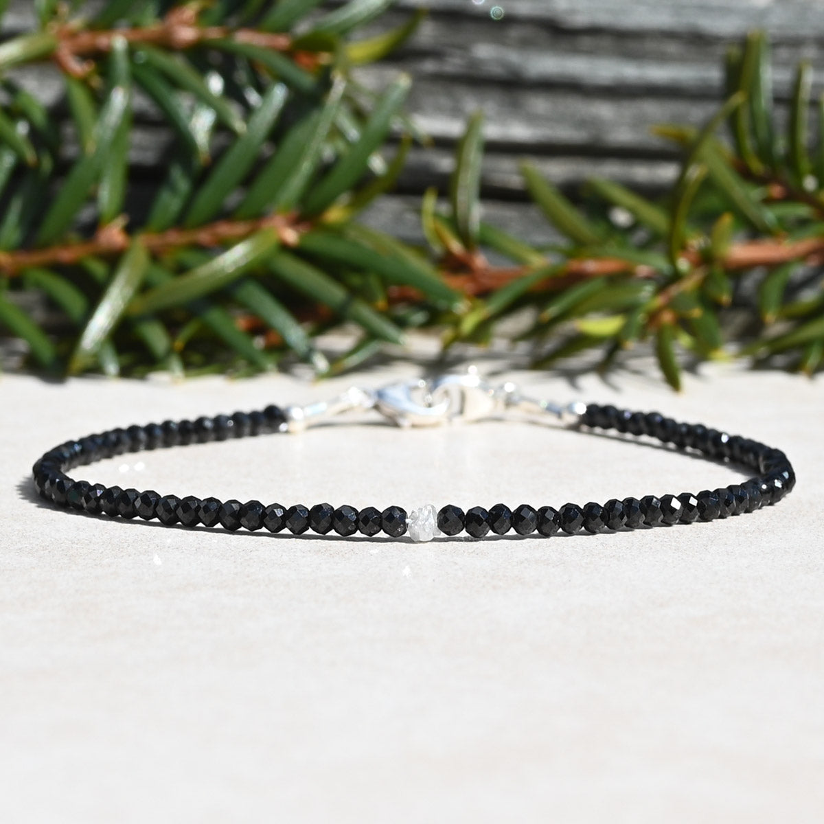 This delicate bracelet combines the allure of Raw diamonds with the elegance of black spinel beads. It features genuine raw diamond, making it a perfect piece of gemstone jewelry for those born in April. This bracelet is designed to be dainty and lightweight, making it an ideal Mother's Day gift for her.