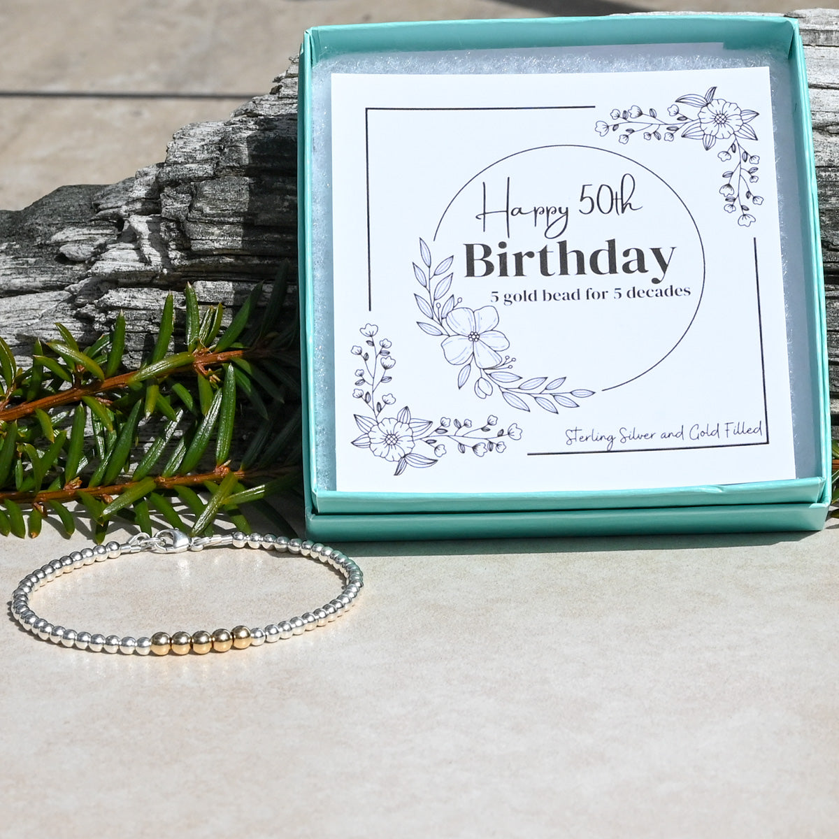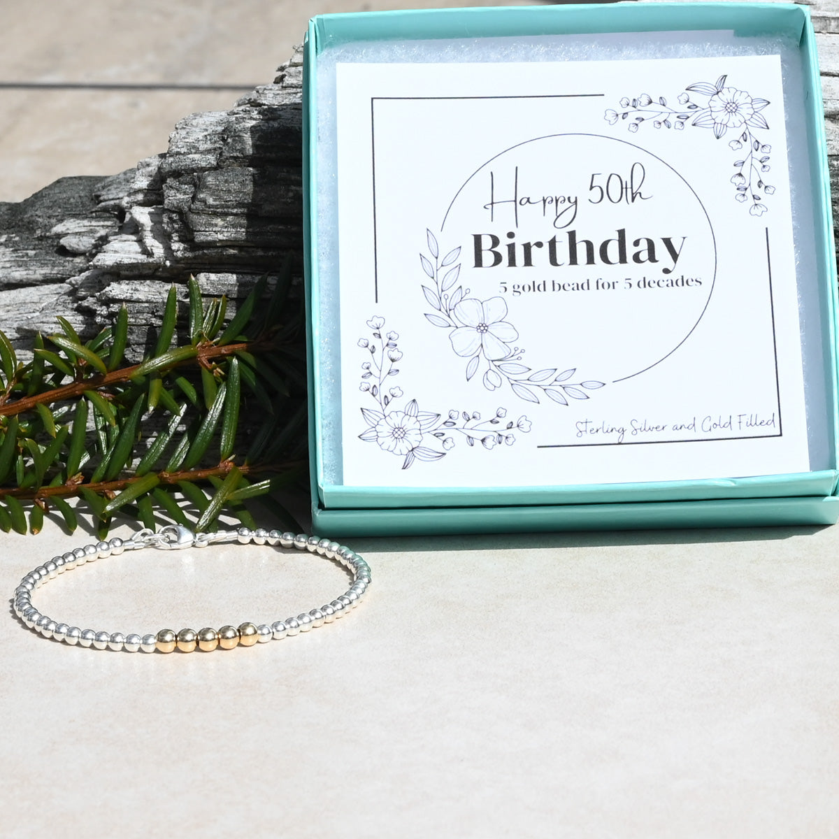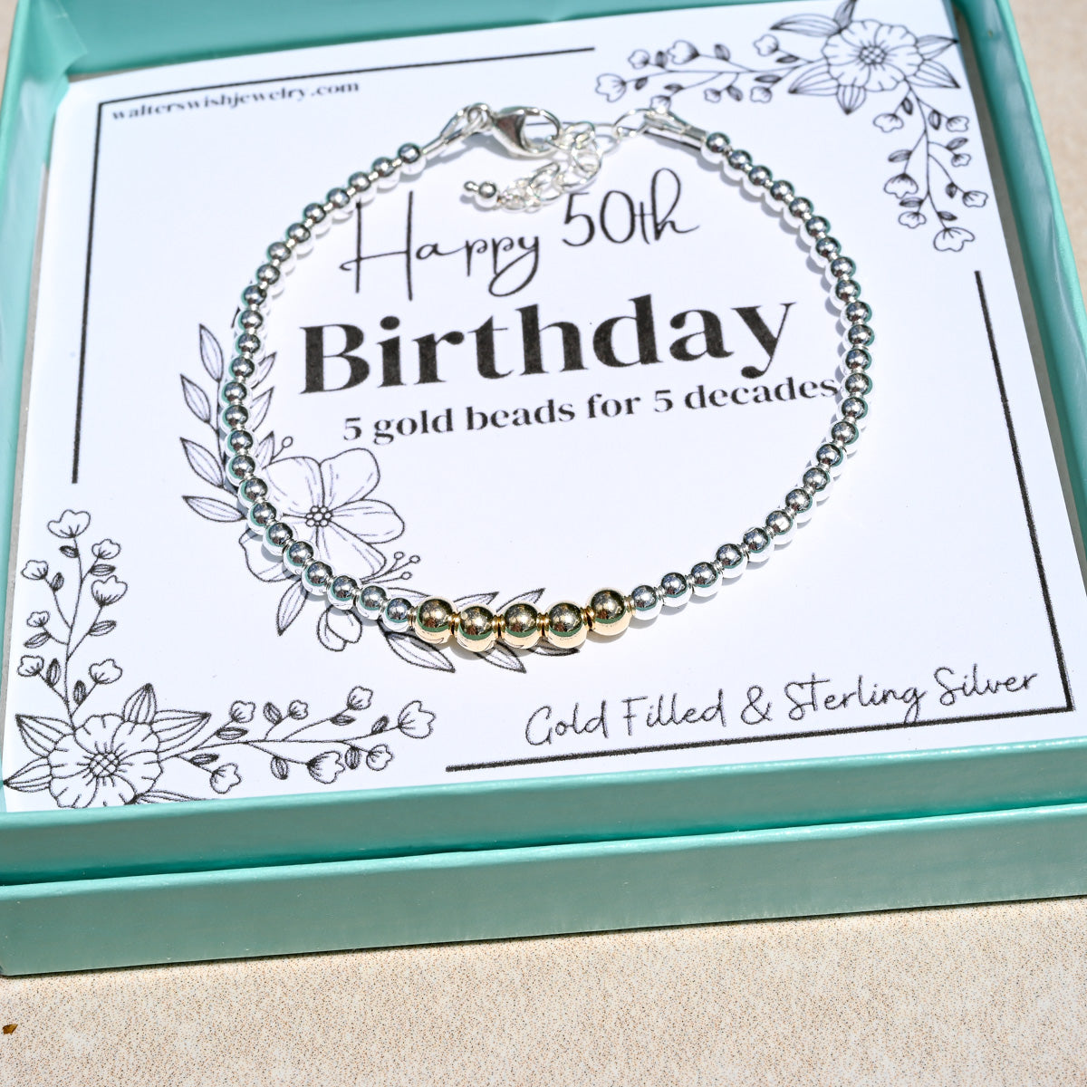 Celebrate a milestone birthday or anniversary with our exquisite sterling silver and gold-filled beaded bracelet. Each gold bead symbolizes a decade, perfect for marking 10th, 20th, 30th, 40th, 50th, 60th, 70th, 80th, or 90th. This milestone bracelet makes a thoughtful gift for a special birthday, anniversary or a beautiful keepsake for commemorating your own milestone. Each bracelet comes in a decorative box with a card for the specific milestone card.