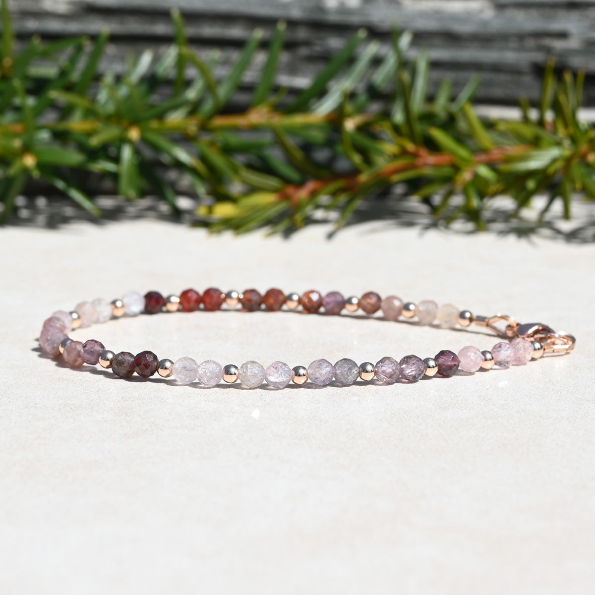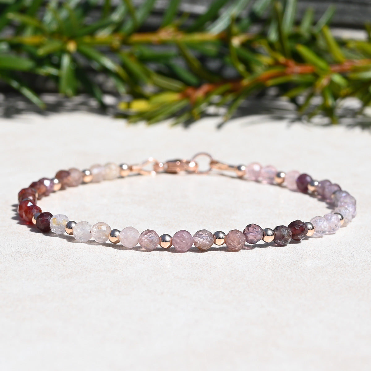 This stunning natural multi spinel and rose gold filled beaded bracelet will make you feel elegant, confident, and special. This bracelet will add a touch of personal style to your look. Perfect for any occasion, it's a stunning addition to your collection or a thoughtful gift.