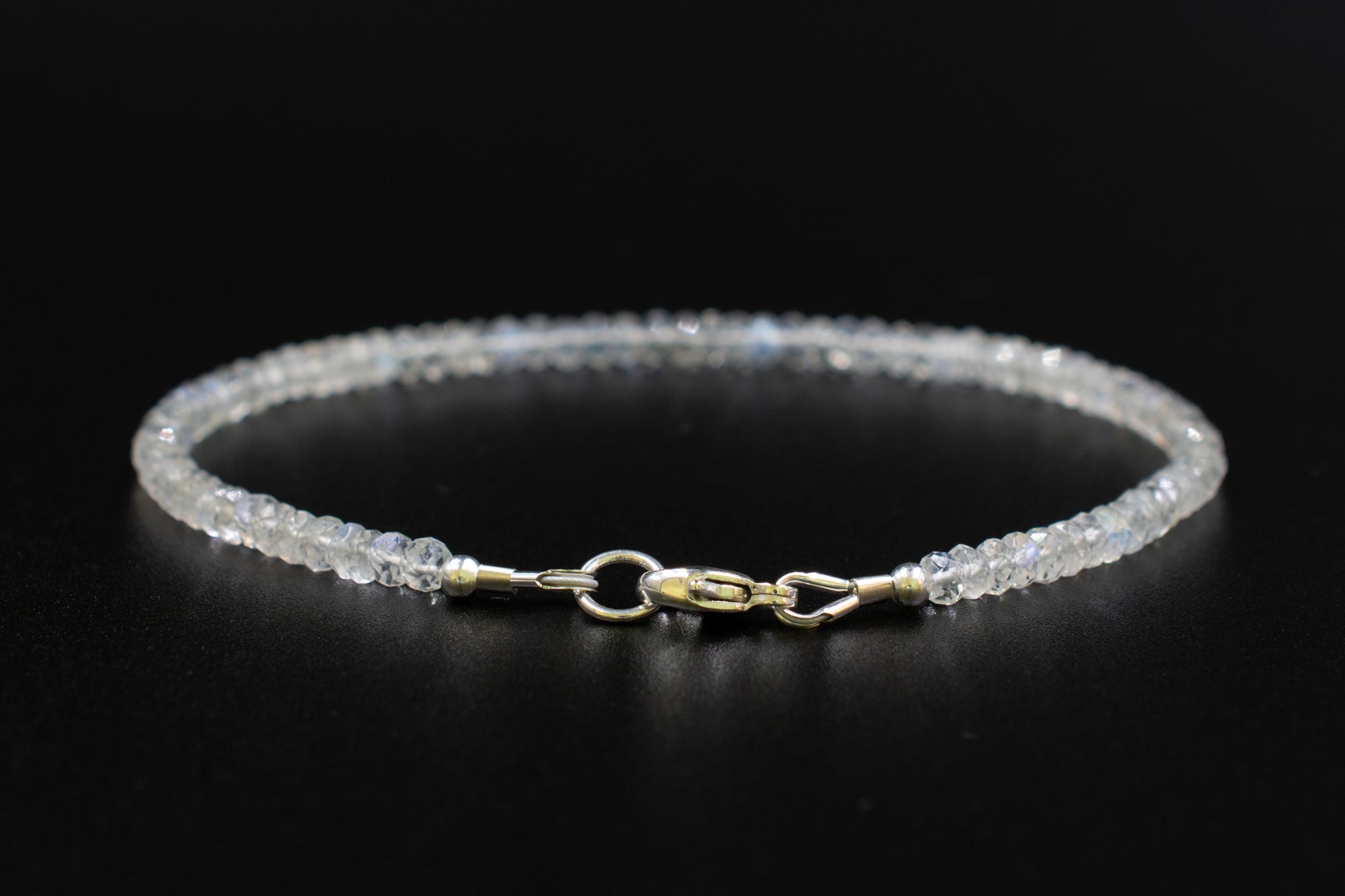 This exquisite dainty Natural Rainbow Moonstone bracelet is a delightful adornment that can enhance even the most sophisticated outfit. With its June birthstone charm, it offers an understated elegance whether worn-solely or stacked with other bracelets.