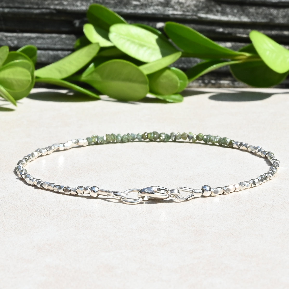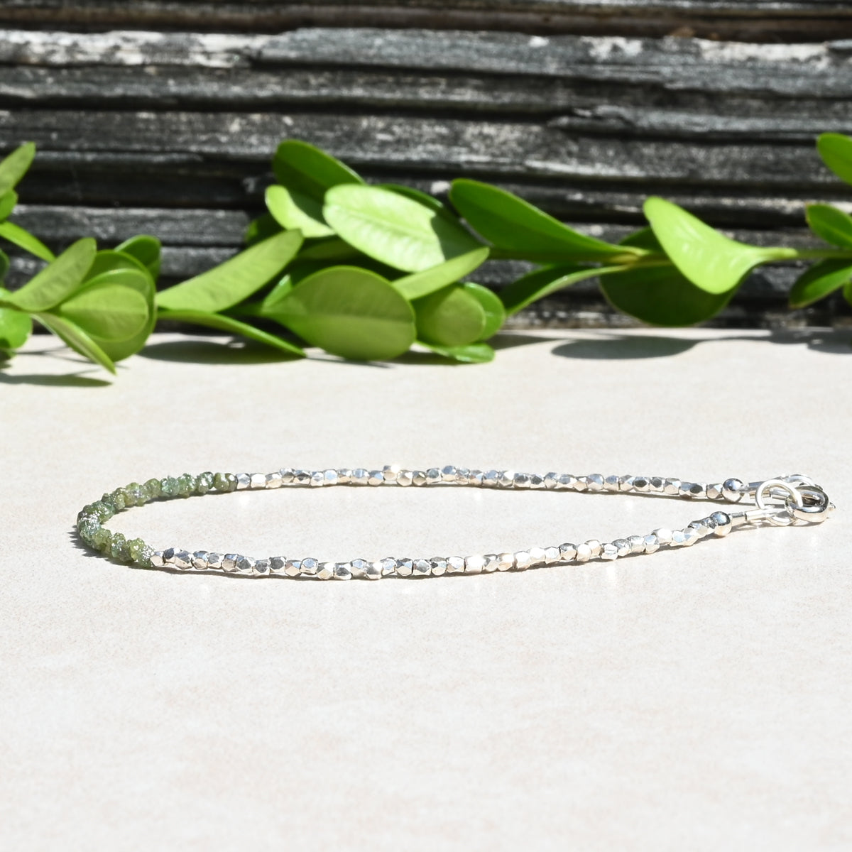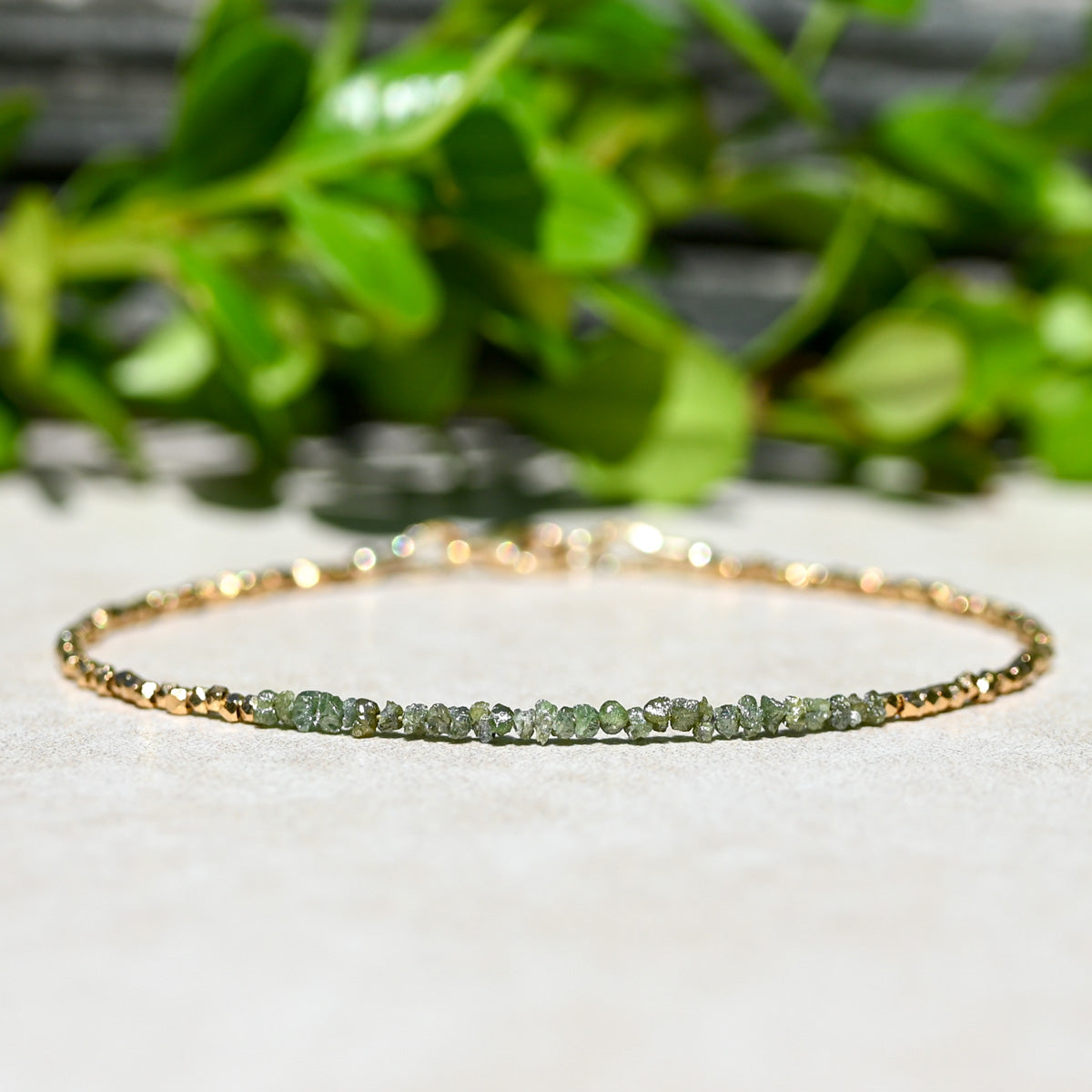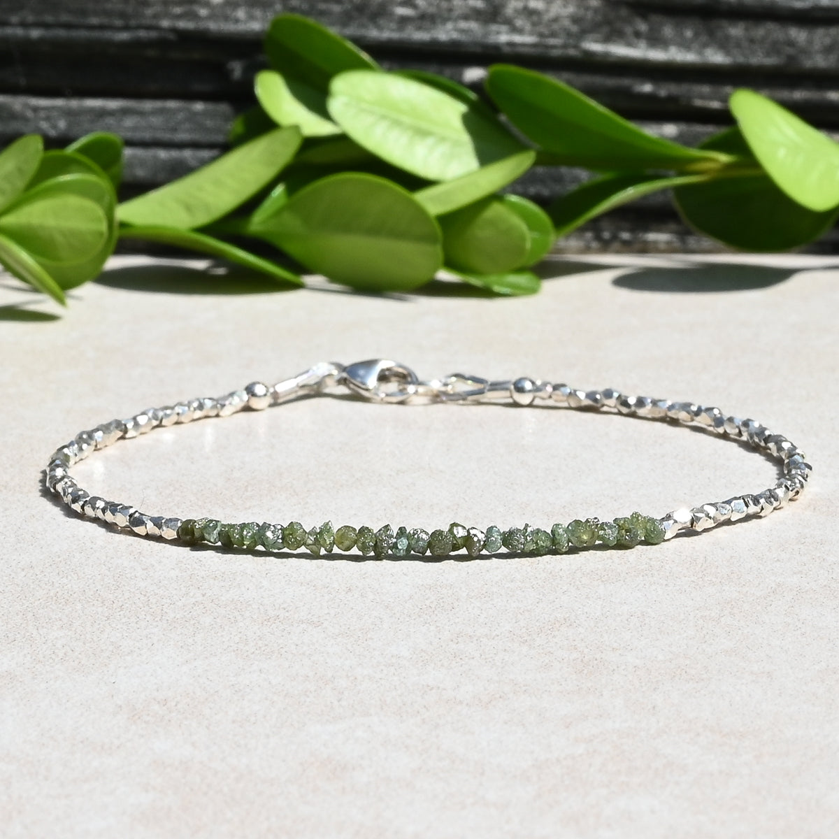 Add a touch of elegance to your wrist with this stunning green diamond bracelet featuring raw rough diamonds. These rare green diamonds, the birthstone for April, make it the perfect gift for any woman who loves minimalistic and unique jewelry. Perfect for any occasion, this bracelet is a must-have in every jewelry collection.