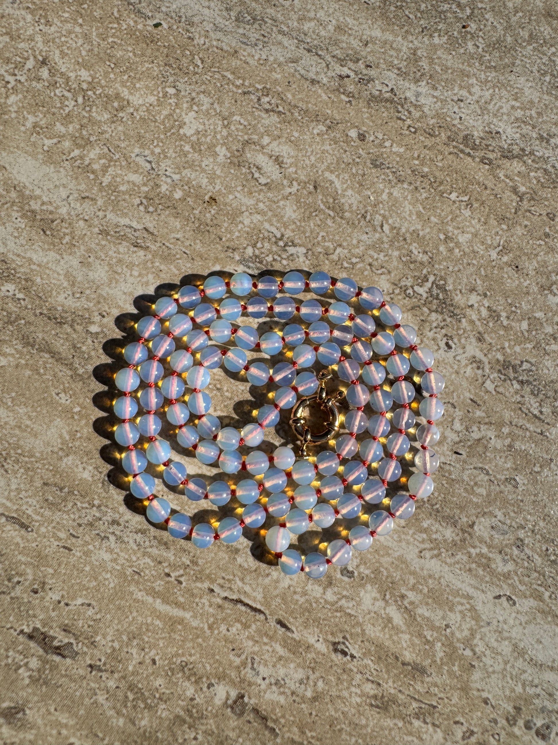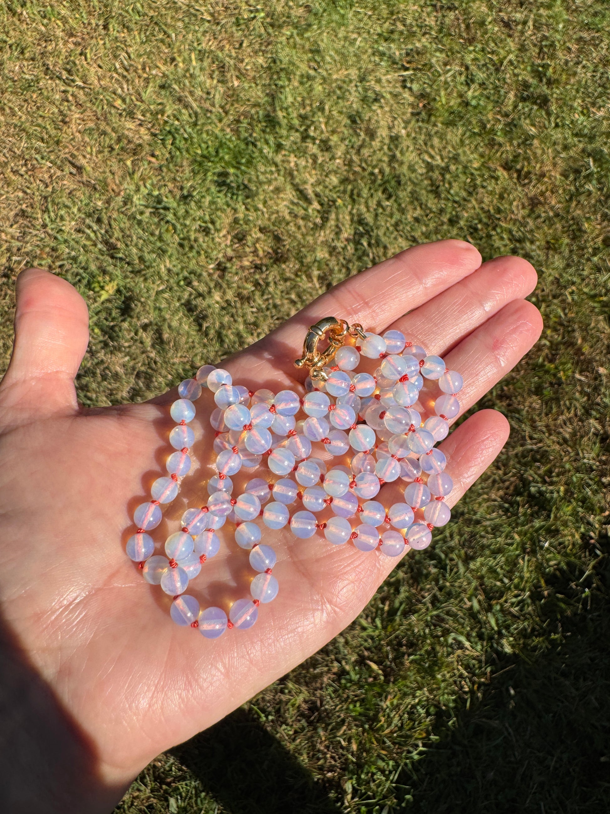 This listing is for an Oplaite hand knotted necklace with 108 beads on coral colored silk. It is 31.5 inches long.